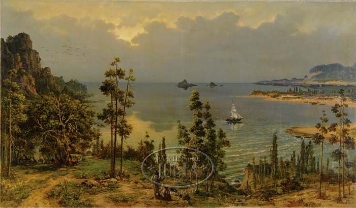 ALEXANDR ALEKSANDROVICH KISELEV (Russian, 1838-1911) THE HARBOR OVERLOOK. Large unframed oil on canvas panoramic scene shows a single mast sailboat going left to right through a bay. Beach areas are seen on the right side with other sailboats dotting the shoreline. Foreground has a Gypsy camp with horses, people around a fire and covered wagon, presumably a traveling circus. A man is standing at the center foreground with a seated bear on leash. A large flock of birds is seen on left cliff edge and a bright setting sun is seen behind clouds and reflects in water. Signed in Cyrillic bottom right. PROVENANCE: Christies; Sale #5813. SIZE: 39-1/4” x 66-3/4”. CONDITION: Discolored varnish layer, minor inpainting. Generally very good. 9-90391 LG (5,000-8,000)