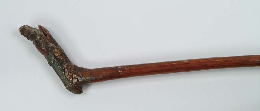 CANE: EARLY CARVED WOOD ORIENTAL CANE. Carved Chinese Foo Dog/dragon handled cane. One piece of wood with dragon having open mouth with red interior and partial gilt and green painted body. Rusted metal tip. SIZE: 44”. CONDITION: Shows use with some chipping. 9-97045 (1,250-1,750)