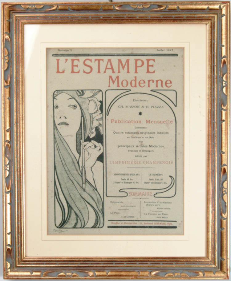 FRAMED MUCHA POSTER. “L’ESTAMPE MODERNE” is the title of this poster. Done in black on gray with rust colored lettering. SIZE: Image is 11 1/4″ by 15 1/2″. Frame is 18 3/4″ by 23″. CONDITION: Some staining to the poster, otherwise good. 5-67381 (300-500)