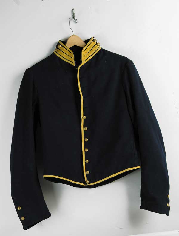 AMERICAN CIVIL WAR U.S. CAVALRY SHORT UNIFORM JACKET. A very nice American Civil War enlisted man’s uniform jacket. Regulation, U.S. Clothing Depot manufactured with 12 buttons single breasted, two on each cuff, two on each side of the standing collar. Front, collar and cuffs decorated in worsted wool yellow tape. Tape extends from two “pillows” at the rear waist to the back of each shoulder. Lined in a denim colored coarse woven wool, pocket in the left interior breast. Sleeve lining is an unbleached linen. The right sleeve, near the shoulder, bears a black stamped inspector’s marking in an oval “__ H. Shafer/U.S./Inspector”, the size is small. CONDITION: Excellent. This jacket is, most likely, surplus showing virtually no signs of active use or wear. A few of the button holes are slightly frayed and a seam or two becoming fragile. Otherwise, colors are bright and strong. A very nice example. 4-49132 CW (2,500-3,000)