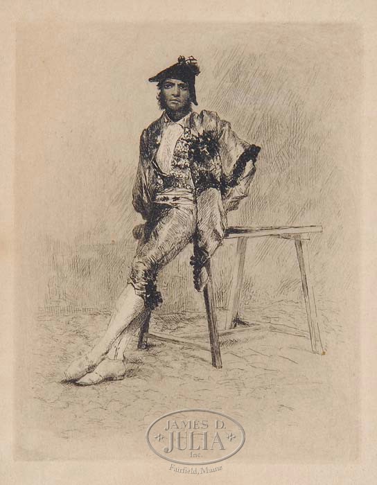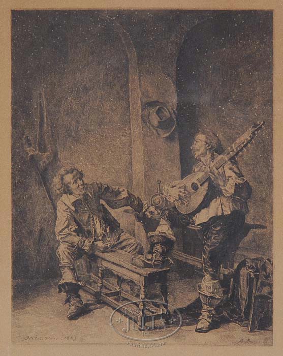 THREE 19TH CENTURY ETCHINGS. 1) Arthur W. Heintzelman (American, 1890-1965) “Country Blacksmith”. Etching shows shoulder portrait of an older man, pencil signed below lower left and numbered “9” lower right in pencil. Housed in a black wood frame with matte. 2) Antoine Pierre Mongin (French, 1761-1827) “Une Chanson”. Etching shows two men in tavern setting, one playing a stringed instrument. After a painting by Jean Charles Meissonier (French, 1848-1917). Signed in plate by both etcher and painted and dated “1865”. Housed in a black frame with matte. 3) Unsigned etching of a man leaning against a table. Housed in a brown wood frame with matte. SIZE: 1) Sight: 6-1/2″ x 5″. Image: 5-1/2″ x 4-1/2″. 2) Sight: 7″ x 5″. Image: 5-1/4″ x 4″. 3) Sight: 6-1/2″ x 5″. Image: 5″ x 4″. CONDITION: Not examined out of frame. 1) Brown toning, no rips or tears evident. 2) Overall brown toning, no rips or tears evident. 3) No rips or tears evident, otherwise good. 9-95594 (300-500)