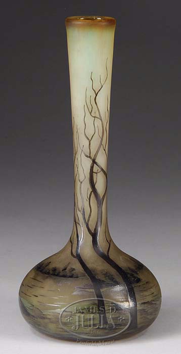MULLER FRES ENAMELED VASE. Interesting Muller vase has enameled decoration of barren trees with water and forested shoreline in the background. Brown and gray enameled decoration is done against a frosted green to amber ground. Signed on the side with enameled signature “Muller Fres Luneville”. SIZE: 7-3/4″ h. CONDITION: Very good to excellent. 5-66816 (600-800)