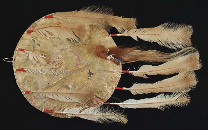 PLAINS INDIANS STYLE SHIELD. Approximately 18” in diameter. Outside edge is decorated with applied feathers and the hide is decorated with an old barely legible painted design. CONDITION: Overall condition is good. Painted decoration is faded and a few feathers are missing. 4-57707-2 JJK019 (800-1,200)