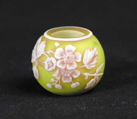 ENGLISH CAMEO THREE COLOR MINIATURE BOWL. Overlay colors of white over red over citron with a cameo floral decoration and dragonfly. SIZE: 1-5/8” dia. CONDITION: Very good to excellent. 5-69148 (400-600)