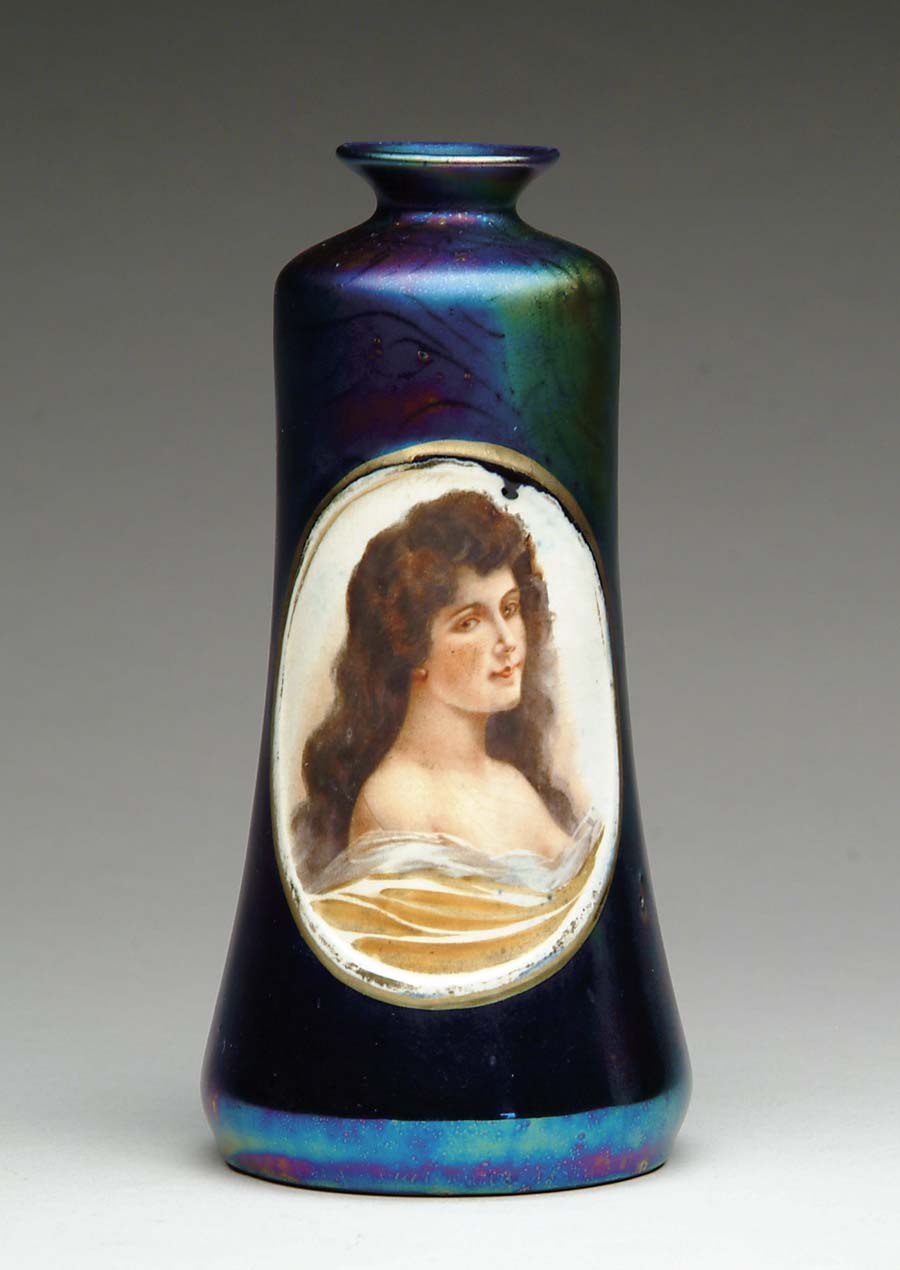 AUSTRIAN PORTRAIT VASE. Rare Austrian vase has magnificent bright blue iridescence with flashes of gold, green and purple. Center medallion is heavily enameled with a portrait of a beautiful woman with long flowing brown hair. Impressed on the underside “70980” and “76”. SIZE: 7-1/2 in. t. CONDITION: Minor crazing to enamel portrait, otherwise very good to excellent. Collection of Dr. C. & Margaret Chastain 5-61419 (400-600)