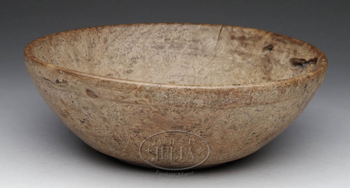 EARLY WOODLANDS BURL WOOD TURNED BOWL. Late 18th/early 19th Century. Turned bowl with nice burl figuring. SIZE: 14-3/4” dia. CONDITION: Very good. Old if not original crack in edge and opened knot on rim. 9-29273 (2000-3000)
