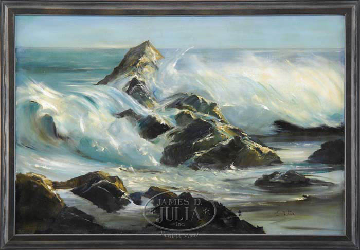 J. FULTON (American, Mid 20th Century) CRASHING WAVES. Oil on canvas scene shows waves crashing onto rocky shoreline with tidal pools. Light reflects in wave tops. Signed lower right. Housed in a modern black molded wood frame. Signed lower right. SIZE: 24” x 36”. CONDITION: Yellowing varnish, otherwise very good. 9-73489 (300-500)