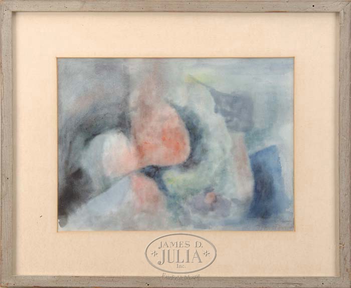 CHARLES E. MARTIN (American, 1910-1995) “ROCKS ALONG THE SHORE”. Impressionistic watercolor shows round objects in light red and blue colors. Signed lower right. Housed in a gray painted frame with white matte. Exhibit label from the Ruth White Gallery, New York with artist name and title. SIZE: SIGHT: 11” x 15”. CONDITION: Good. 9-71726 (200-300)