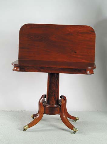 FINE BALTIMORE MAHOGANY CLASSICAL CARD TABLE. Molded edge D-shaped top, which opens and turns to make square rounded corner top. Conforming frieze and in concave form. Round column supported by a molded top hub supported by four open scroll top outsweeping legs with animal claw brass feet ending in brass castors. SIZE: 29-1/2” h x 35-1/4” w x 17” (closed); 34” (open). CONDITION: Slight warp to top, otherwise very good. 9-96834 (3,000-4,000)