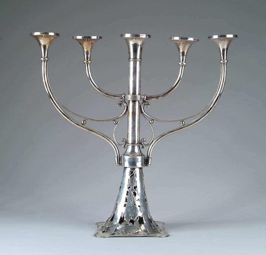 SILVER PLATED CANDELABRA. Wonderful candelabra has pierced and chased floral base extending up to support five-arm candelabra. Marked on the underside “The VanBergh Silver Plate Co. 1457”. SIZE: 19-1/2” t x 20” w. CONDITION: Very good to excellent. 5-68572 (0-0)