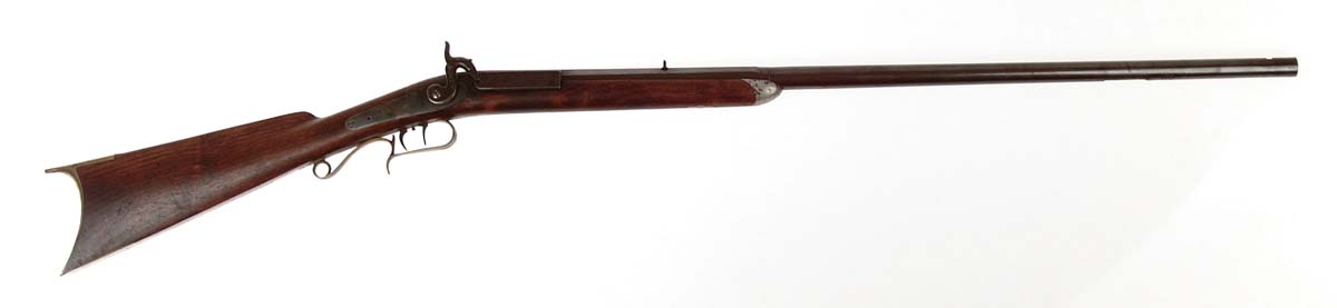 RARE & UNUSUAL AMERICAN PARLOR RIFLE. Cal. About 177. NSN. Very unusual little rifle with 30-3/4″ oct to rnd bbl of which only about the front 5-3/4″ is actually bbl. It is loaded from the front with a single ball without a powder charge with propellant by a percussion cap, loaded through a rectangular opening in the bottom of the bbl. It has a back action lock with percussion style hammer that connects to a rod, which extends to the upper end of the bbl, which strikes the percussion cap. It is mounted in a nicely figured walnut stock with rounded pewter nose cap with the rest of the furniture made of brass. It has a serpentine trigger guard with dbl set triggers & crescent buttplate with toe plate. CONDITION: Very fine. Iron retains most of a very old professionally restored rust blue. Front sight is missing. Stock is sound and retains most of an equally fine old professionally restored finish. Mechanics are fine. 4-54274 JR475 (500-1,000)