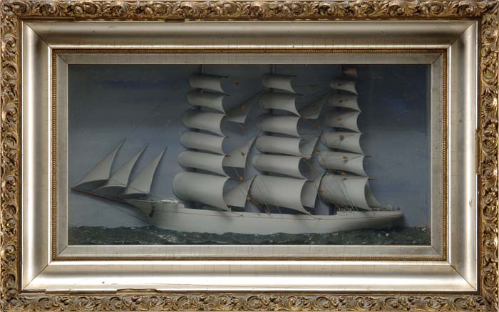 FINE ANTIQUE SHIP DIORAMA. Three dimensional carved wood ship having a white hull, three-mast and full white sails. It flies the American flag and has the name “Anna” on the bow. Blue and white cloud background with a dark green sea. Original gesso decorated gilt frame with gilt liner. Circa 1880-1910. SIZE: Overall is 16” x 25-1/2”. CONDITION: Very good. 9-70679 (800-1,200)