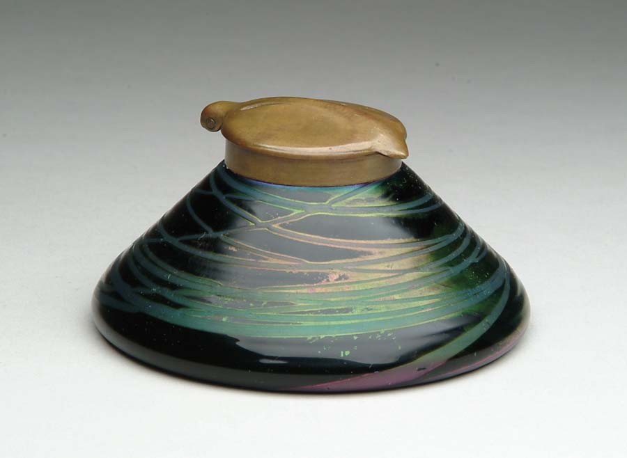 PALME-KONIG INKWELL. Wonderful blown glass inkwell has deep purple iridescent background with green iridescent threading surrounding the body. The well is topped with a bronze stylized leaf cap. Comes complete with clear glass insert. SIZE: 4 in. dia x 2-1/2 in. t. CONDITION: Open bubble on edge of insert, otherwise very good. 5-61528 (500-700)