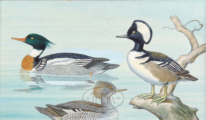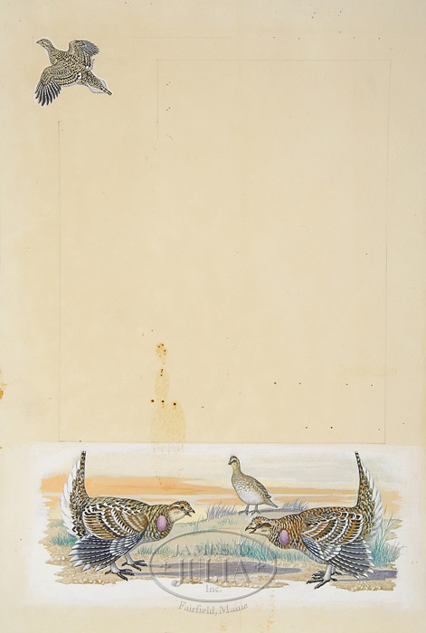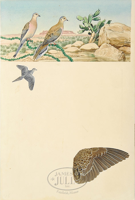 ATTRIBUTED TO ARTHUR B. SINGER (American, 1917-1990) 32 BIRD ILLUSTRATIONS. 32 unsigned separate watercolor bird illustrations in fine color and detail. Most depict ducks and game birds in their natural habitat. One of the 32 is a watercolor scene of the artist with guide in a canoe in western landscape. Probably illustrations for a book, magazine or stamps. Arthur Singer helped to illustrate over 20 books and worked with several magazines. Known as one of America’s most prolific and best bird and wildlife watercolorist. An extraordinary opportunity to acquire a collection of his work. SIZE: Range from 4″ x 8-1/2″ to 11″ x 9″. PROVENANCE: A New York State collector’s Estate. CONDITION: Generally very good, there may be some tape marks or light foxing. 9-90939 (3,000-5,000)