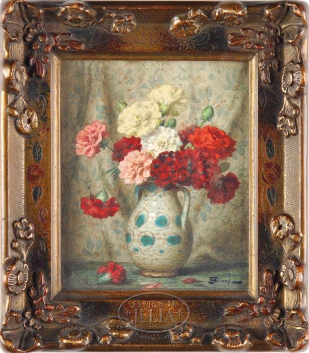 TWO STILL LIFE WORKS. 1) Eugenie-Juliette Fauz-Froidure (French 1886-) Floral still life. Watercolor on paper shows a blue-spotted pitcher with colorful pink, white and red flowers all against a printed fabric. Signed bottom right. Housed in a fancy decorated flower frame SIGHT SIZE: 6-1/4”h x 5”w. 2) Signed. (French, 19th- 20th Century). White vase of flowers. Small watercolor scene shows red and orange flowers in white vase. Signed bottom right E. John ? Housed in a small decorated frame. SIGHT SIZE: 4”h x 2-1/2”w. CONDITION: Generally good. 9-90211 SM (1,400-1,800)