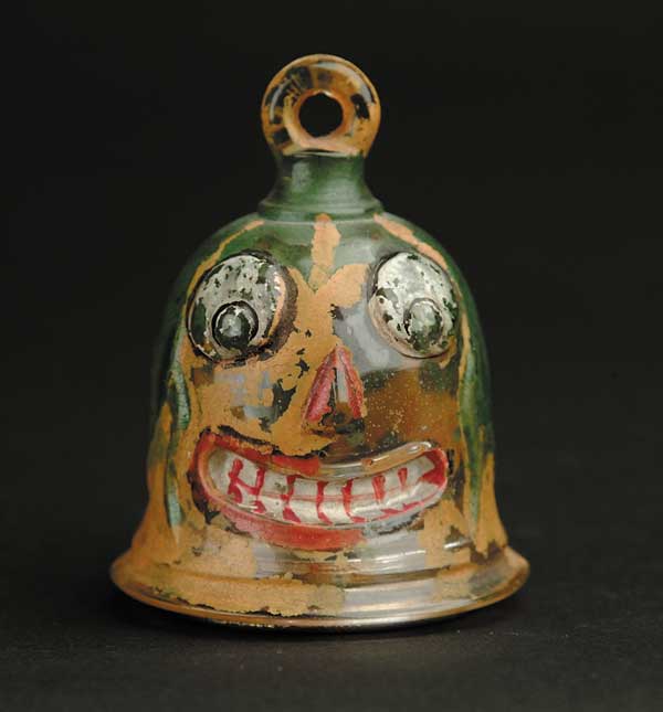 GOBLIN HEAD CANDY CONTAINER Ca. 1920. Bell shaped orange colored container with three large leaves for hair, raised eyes and nose, deeply sunken and painted mouth. Large loop on top. Gold-tone screw-on cap. SIZE: 3-1/2″ t. CONDITION: Very good. 1-29856-450 (300-400) Auction: Advertising, Toy & Doll - Spring 2003 Please Note: All prices include the hammer price plus the buyer’s premium, which is paid by the buyer as part of the purchase price. The prices noted here after the auction are considered unofficial and do not become official until after the 46th day. |