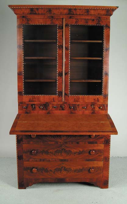 TWO PIECE MAHOGANY ANTIQUE SECRETARY. Top section with ogee molded cornice, two black doors with decorative molding and three small drawers, each having two turned wood knobs. Bottom section has fold over writing surface with replaced new leather like writing surface. Graduated three long drawers with wood knobs. Shaped skirt and decorative corner carving. Nicely matched mahogany veneers. Circa 1830. SIZE: 80-1/2” h x 21” d x 42” w. CONDITION: Very good. 9-96420 (1,500-2,500)