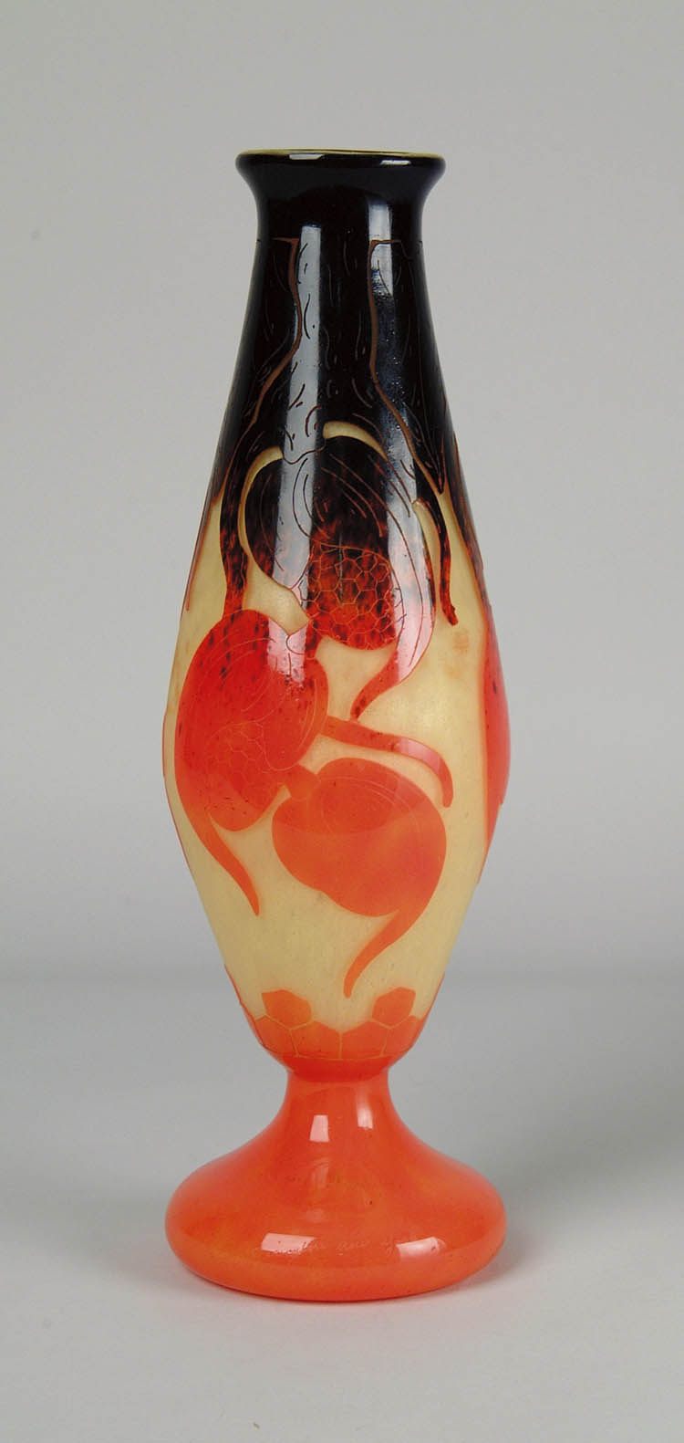 LE VERRE FRANCAIS CAMEO VASE. Acid cut stylized orange fruit shading to indigo leaves on yellow mottled background. Signed on foot “LE VERRE FRANCAIS”. SIZE: 15 3/4″ tall. CONDITION: Very good to excellent. 5-67925 (2,500-3,500)