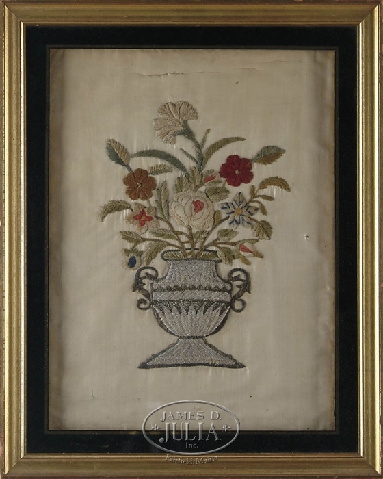 ENGLISH NEEDLEWORK CHENILLE AND BEADWORK PICTURE. A large two handled white and silver vase made of clear and silver beads with wire needlework edges and handles. A spray of flowers in colorful chenille work. All on a white silk background. Nicely housed in a shallow shadowbox frame with reverse painted border in black and gold. SIGHT SIZE: 18-1/4” x 13-3/4”. CONDITION: Generally very good, horizontal split to back top of silk background and one noticeable hole on right side. 9-27146 (800-1200)