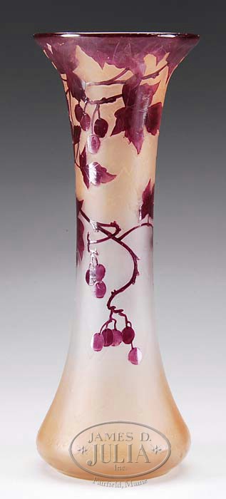 LEGRAS CAMEO VASE. Lovely Legras vase has cameo grapevine and grapes descending from the lip. The cameo decoration is stained with a rich purple coloration and is set against a frosted acid-textured background of apricot shading to clear shading to apricot. Signed on the side in cameo “Legras” with same purple staining. SIZE: 13-3/4″ h. CONDITION: Very good to excellent. 5-67801 (400-600)