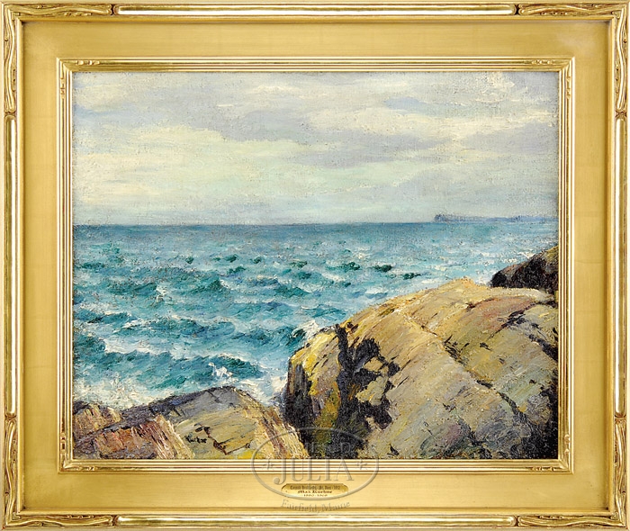 MAX KUEHNE (American, 1880-1968) “CORNISH HEADLANDS-ST. IVES-1912”. Large oil on canvas coastline scene shows a wavy ocean, foreground being coastal ledge rock and a point of land in the right horizon. Colorful blue and white sky. Signed with Estate stamp bottom left “Kuehne”, also stamped on back top stretcher. Titled and dated on back of cardboard backing. Housed in an outstanding carved and gilt wide replacement frame. Artist has used heavy impasto to create depth in the painting. SIZE: 24″ x 30-1/4″. CONDITION: Edge strip lining, very good. 9-92668 (4,000-6,000)