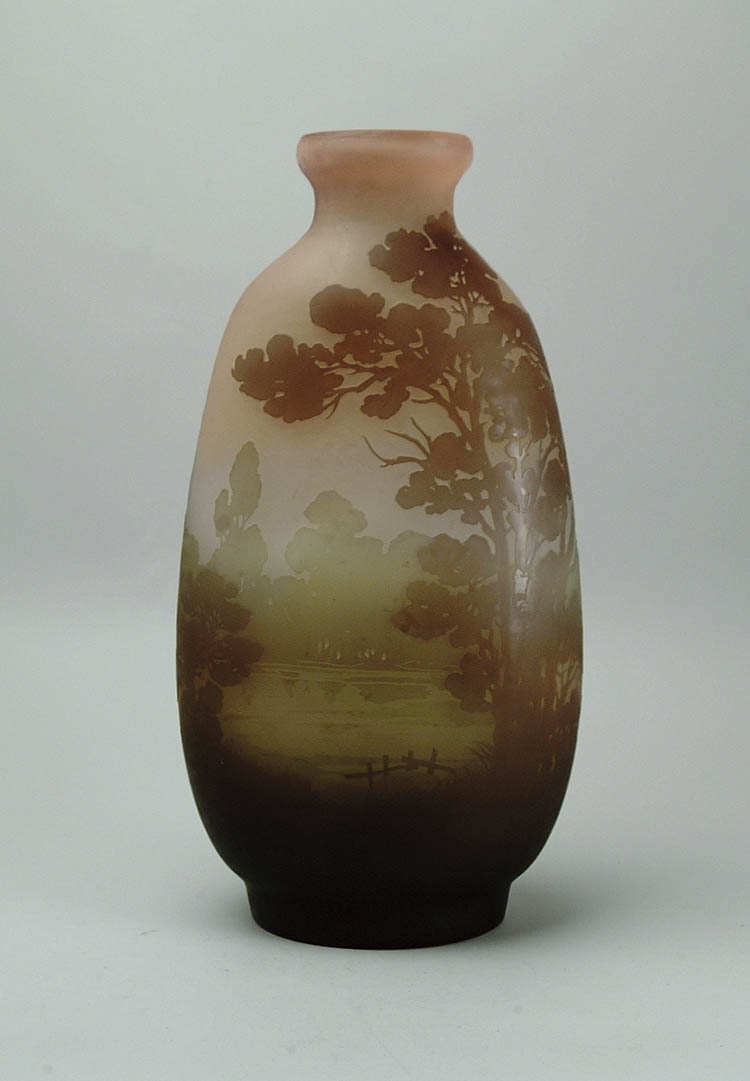 SIGNED GALLE CAMEO SCENIC VASE. Pale brown and green scene on peach to frosted ground. Signed star “GALLE” in cameo on side. SIZE: 16 3/4″ tall. CONDITION: Very good to excellent. 5-67461 (4,000-6,000)