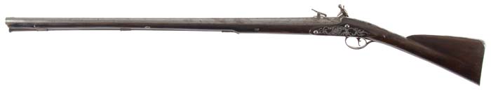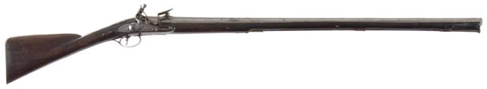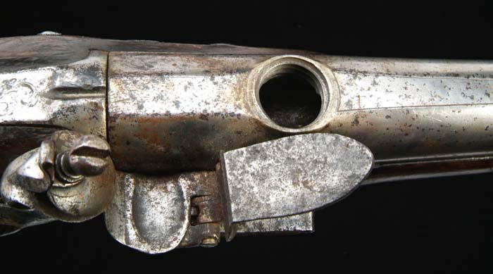 RARE BREECHLOADING FLINTLOCK RIFLE. Cal. 76. 34-5/8” rnd. bbl. Walnut stock. No marks are visible on lockplate or bbl but style appears to be English. A 3/4“ hole has been drilled in top of bbl with a coarse threaded plug installed for loading. Wings on plug act as a rear sight, although it was also grooved for the added rear sight dovetailed on top of bbl, which is now missing. Brass spider front sight is about one-half inch back from muzzle. Iron button head ramrod is a replacement. CONDITION: Metal has been lightly cleaned with moderate pitting remaining on lock, triggerguard and buttplate. Stock has normal handling marks with slight repairs on forearm. Mechanically fine. 4-30895 FS11 (5,000-7,000)
