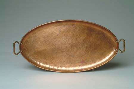 RARE LARGE GUSTAV STICKLEY HAMMERED COPPER OVAL TRAY. Oval copper tray with all over hammered design having a riveted copper handle on each end. Reverse with “ALSIKKAN” stamp. SIZE: 21″ l x 11″ w. CONDITION: Good, no dents or scratches, patina cleaned. 5-70081 (700-900)