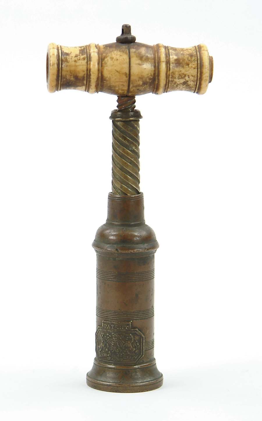 EARLY ANTIQUE BRASS AND CARVED BONE CORK SCREW. Brass barrelled King’s screw cork screw with turned bone handle which held a brush at one end which is lacking. Royal Coat-of-Arms plaque on side with “Patent” atop. SIZE: 7”; 9-3/4” extended. CONDITION: As noted above, small crack to bone, otherwise good. 9-97195 (200-300)