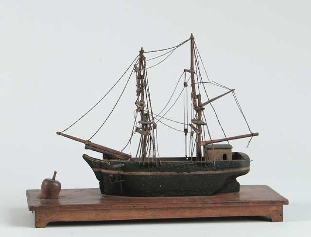 SMALL WOOD SHIP MODEL. Model is mounted to wood platform. Ship has two masts with rigging, no sails. Black hull. SIZE: Ship is 8” h x 11” l. CONDITION: Good. 9-92460 (200-300)
