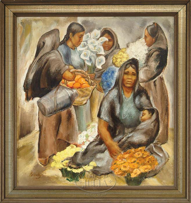 EMILY LANSINGH MUIR (American, 1904-2003) MEXICAN FLOWER MARKET. Oil on canvas scene shows five women, one with infant. Each having colorful flowers and one with basket of fruit. Signed lower left “Emily”. Housed in a decorative wood molded frame. SIZE: 26” c 24”. CONDITION: Very good. 9-70189 (2,000-3,000)