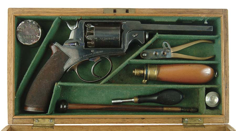 CASED ADAMS PATENT PERCUSSION REVOLVER. Cal. 45. SN 91. Fine 5-shot DBL action/single action revolver with 5-3/4” oct bbl, rammer mounted to the left side of the bbl, the top flat marked “J.W. Edge. Manchester”. It has nicely checkered 1-pc wood grip with smooth butt cap, the cylinder & frame are marked with a patent number and there is a safety on the right side of the frame. The case is typical English oak construction, green felt lined, compartmented for the various accessories which include a wood & brass wiping rod, ebony handled nipple wrench, small “C&J.W Hawksley” bag flask with ring in the bottom, a matching nickeled round oiler bottle, a reproduction small caliber Colt type brass bullet mold and an Eley cap tin. It has a blue Adams label in the lid. The case has brass screws around the perimeter and a center round brass medallion. CONDITION: Extremely fine. Revolver retains about 95% bright high polish blue with light edge wear and pitting around the forcing cone and on the edge of the top strap. Trigger retains 75-80% bright blue and the trigger guard is flaked to a gray patina. Grips are extremely fine with very minor diamond point wear. Mechanics are fine with bright shiny bore and scattered very fine pitting. Case is missing a sliver from the bottom and has a crack with two other grain checks in the lid. Lining is lightly soiled with one small break in a divider, otherwise fine. 4-51503 JR726 (5,000-6,500)