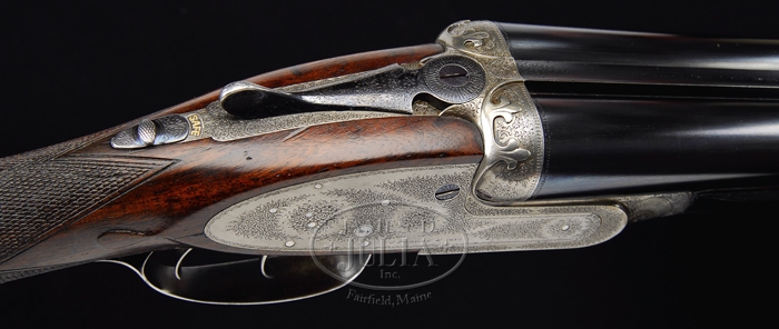 (Additional Information) Please note: This item accompanied by factory documents confirming refurbishment and upgrades completed 1983. Consignor states that the guns remain unfired since the completion of this work. *CASED PAIR PURDEY HAMMERLESS SELF OPENING SIDELOCK EJECTOR GAME GUNS. SN 13372, 13373. Cal. 12 ga. Both guns have 30″ chopper lump bbls with hidden third fastener and concave game rib. The bbls are marked on the top of the rib” 1″ and “2” respectively and ” J. Purdey & Sons Audley House. South Audley Street . London.” ” Made of Sir Joseph Whitworth’s Fluid Pressed Steel.” BBls show a London re-proof for 2-3/4″ chambers and are proofed at .729 for all bbls. The action has beautifully executed double fleur-de-lis fences and extremely fine house style rose and scroll engraving, probably executed by noted Purdey engraver J. Lucas. The lockplates are marked “J. Purdey & Sons” and the bottom of the action is marked “Purdey’s Patent”. The top lever is marked “Patent”. Shotguns features dbl triggers and automatic safeties. The triggerguards show about 60% English scroll with SNs “13372” & “13373” engraved. The guns have nicely matched and well figured and streaked straight grip European walnut buttstocks measuring 14-5/8″ over a thin Silvers-type pad on gun #1 and 14-1/2″ over a 1/2″ wood spacer and checkered horn buttplate on gun #2. Both guns measure 13-7/8″ to the end of the orig wood. There are silver ovals on the bottom of the buttstocks marked with the initials “JCM”. These initials also appear on the case. Splinter forends have Anson release. Guns have finely executed checkering in typical Purdey style. The factory letter indicates that the guns were restocked in 1949 to a LOP of 14-7/8″. Butt treatment is not specified. The guns are accompanied by their oak and leather case with brass corners and medallion on the top. Accessories include two pair of correct period snap caps, one oil bottle, new pull-through cleaning kit, set of two unmarked horn-handled turn screws, broken cartridge extractor, and horn-handled striker bushing wrench, and cleaning equipment including 2-pc rosewood cleaning rod and usual brushes, mops, jags, etc. Case also has its orig key. Gun 1) Bore diameter: left -.736, right -.736. Bore restrictions: left -.007, right -.8. Wall thickness: left -.023, right -.026. Drop at heel:1-5/8″, drop at comb:1-3/8″. Weight:6lbs 8.5oz. Gun 2)Bore diameter: left -.734, right -.735. Bore restrictions: left -.007, right -.0. Wall thickness: left -.022, right -.026. Drop at heel:1-3/4″ , drop at comb:1-3/8″. Weight:6lbs 9oz. CONDITION: Fine as refinished. Bbls of both guns are tight and on face and ejectors are in time; levers close slightly left of center. Both bbls show about 98% of a re-black, with a very small abrasion on left hand side about 1/2″ in front of breech face on gun #1. Bbl engraving is light, but readable. Bores are bright and shiny. Actions are finished bright with forging striations visible on the bottom of gun #1. Screws and safety levers show most of their new fire blue. Safety buttons show some wear at rear. The forend of gun #1 shows approx. 1″ crack, professionally repaired at right side at forend screw. The triggerguards show worn engraving and about 10% of an old re-black. Stocks have most of an old, hand-rubbed, oil finish, with a little oil added to gun#2, and have a few nicks and dents from use. 4-31919 MGM1 (30,000-50,000)