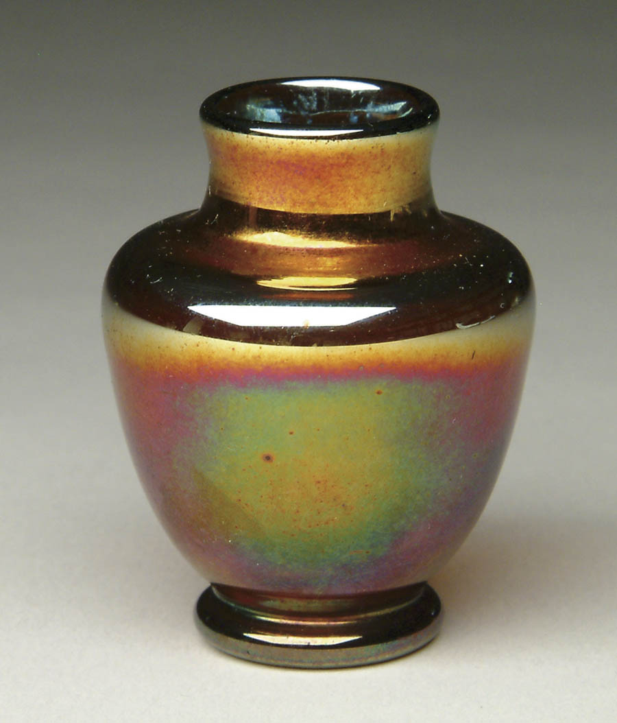TIFFANY MINIATURE CABINET VASE. Miniature red cabinet shoulder vase has mirrored iridescent gold at shoulder against a red background. Signed on underside “L.C.T. B2339”. SIZE: 2-1/2″ t. CONDITION: Very good to excellent. 5-61917 (1,200-1,600)