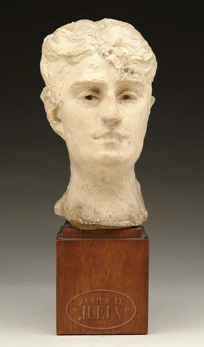 AUGUSTE RODIN (French, 1840-1917) ORIGINAL PLASTER BUST OF MADAME BENGESCU. Titled and signed on right side of neck “M’ Bengescu Rodin”. Well mottled plaster of a neck up bust of a woman’s head. She wears her hair back and looks straight on. Mounted on a stepped wood block. PROVENANCE: Galerie Henri Benezit Paris. SIZE: 8-1/4” h x 6-1/2” d x 4-3/4” w. CONDITION: Nice patina. One chip replaced on back right with two small flecks missing. Otherwise very good. 9-70325 (10,000-15,000)