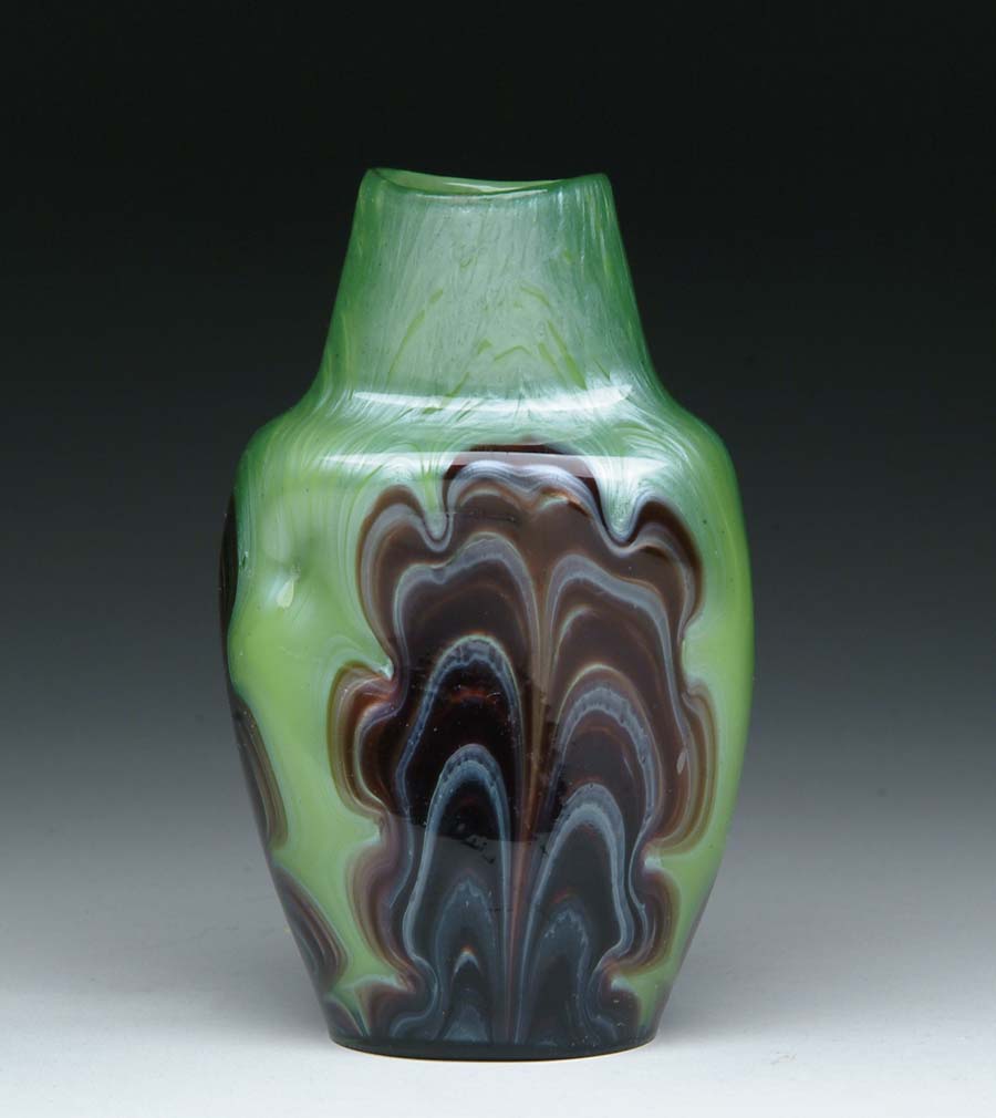 LOETZ DECORATED VASE. Beautiful Loetz vase has brown and silver freeform pulled loop design against a lustrous green and silver background. SIZE: 5-1/2 in. t. CONDITION: Vase apparently fell over while still hot after mfg. and indented the backside, otherwise very good to excellent. 5-61292 (3,000-3,500)