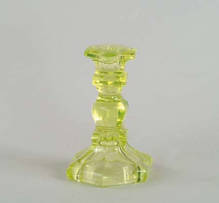 SMALL EARLY CANARY YELLOW CANDLE STICK. SIZE: 5-1/2″h x (base) 3-1/2″w. CONDITION: Very good. 9-96964 (150-250)