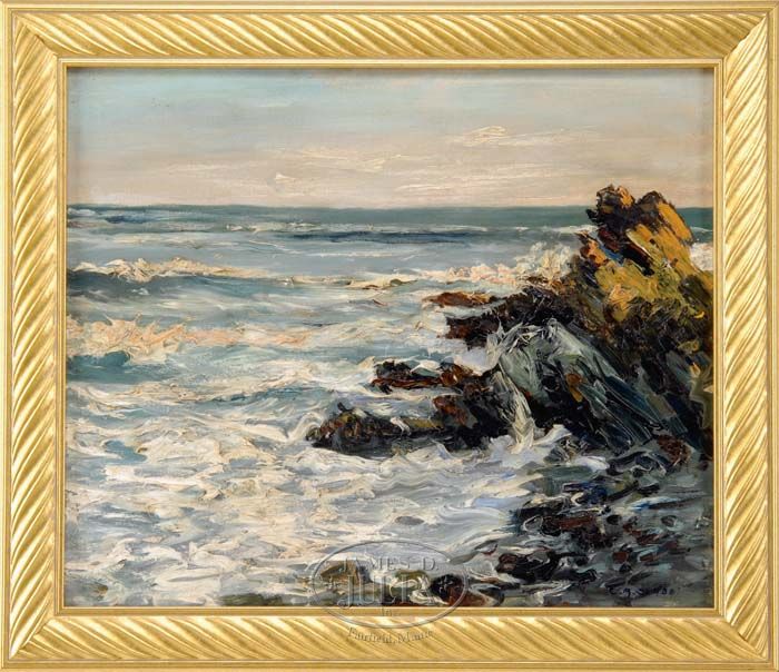CALEB ARNOLD SLADE (American 1882-1961) ROCKY COASTLINE. Fine oil on canvas scene shows waves crashing on upright angled rocky coastline. Signed bottom right “C.A. Slade”. The artist uses a quantity of paint to derive a three-dimensional aspect to his scene. Housed in a decorative gilt wood modern frame. Included with painting is an old picture postcard which has a photo of this painting on the front. SIZE: 18” x 21-1/2”. CONDITION: Very good. 9-74838 MD (2,000-3,000)
