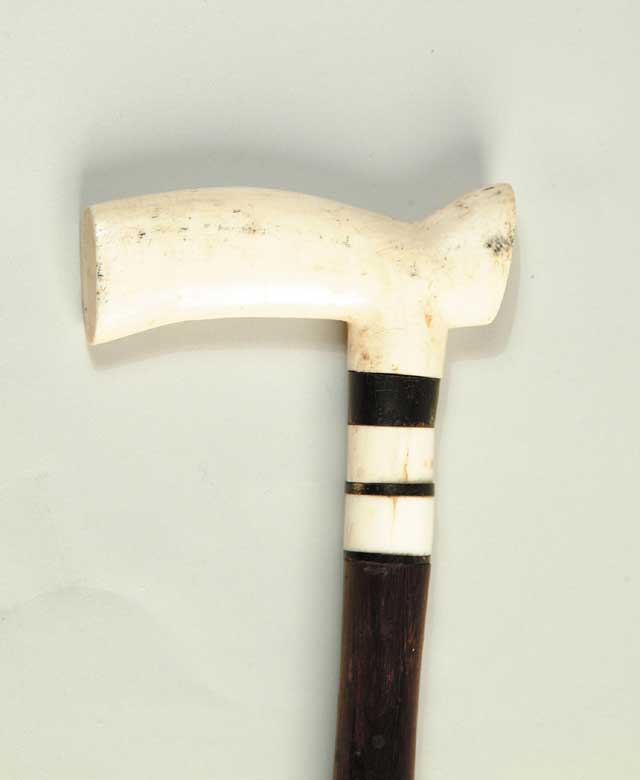 IVORY, BALEEN AND EXOTIC WOOD CANE. Shaft has nine wood sections separated by two baleen rings and one wider ivory ring. Metal ferule at tip. Handle is carved and shaped ivory with alternating baleen, ivory and wood at top of shaft. SIZE: 36-3/4” l. Handle is 4-1/2”. CONDITION: One ivory ring half missing. Handle has some age cracks but generally good. 9-93538 (500-800)