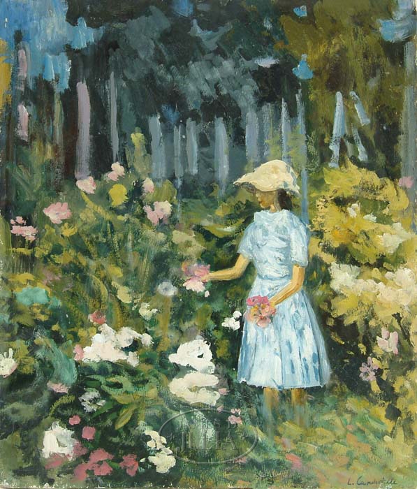 LUCIENNE CAPDEVIELLE (French, 1885-1961) TWO WORKS: “HYERES” AND GIRL IN GARDEN. Both unframed. 1) Small oil on canvas showing a beach with two bathers, sailboats on a colorful ocean and sharp cliffs. Signed lower right “L. Capdevielle” and titled on back. SIZE: 8-1/2” x 10-3/4”. Hyeres is a coastal town in France. 2) Oil on board scene shows a young girl in light blue dress and white garden hat picking flowers. Signed lower right. SIZE: 17-1/2” x 15”. CONDITION: Generally very good. 9-70155 (400-600)