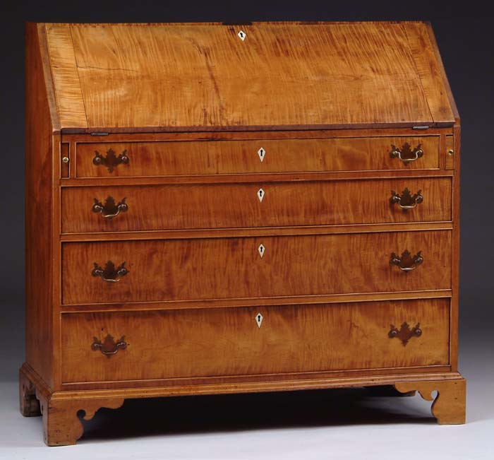CHIPPENDALE TIGER MAPLE SLANT FRONT DESK. The strong solid Tiger maple top, lid and drawers. The pull-down lid has ivory diamond escutcheon plate. The interior set with 9 drawers and 8 cubby holes. The drawers having small brass pulls and lined inlay. The graduated 4 drawers with ivory diamond escutcheon plate and having replaced hardware. Applied molded edge bracket base. SIZE: 43-1/2” high x 44” wide x 19” deep. CONDITION: Some old repair, refinished, age crack to lid, otherwise very good. 9-72046 (2,000-4,000)