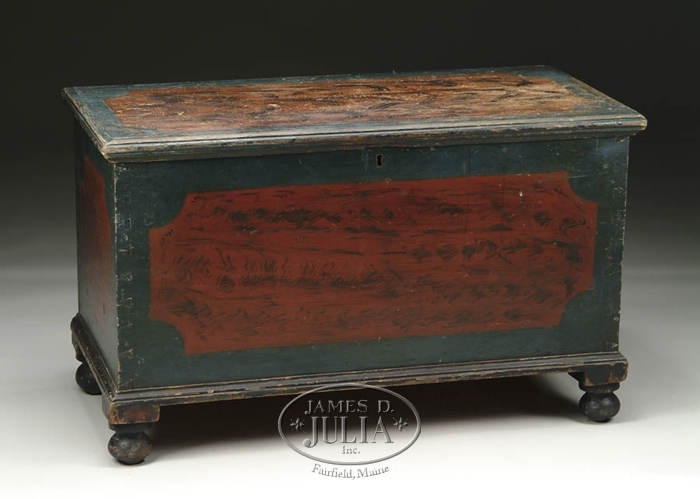 PAINT DECORATED BLANKET CHEST. The six board blanket chest supported by four turned feet is decorated in blue paint with red painted panels having black highlighting to simulate mahogany. Dovetailed case, interior fitted with lidded till. Decoration to sides, front and top. Probably of Virginia origin. SIZE: 21-1/4” h x 35” w x 17” d. CONDITION: Some minor wear to top, otherwise very good. 9-26428 (1500-2500)