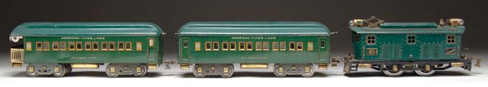 AMERICAN FLYER STANDARD GAUGE TWO CAR PASSENGER SET. Includes locomotive #4684 in medium green with black frame and brass trim. Also includes coach lettered “Pleasant View” in green litho, observation car lettered “Pleasant View” in green litho. CONDITION: Locomotive has original wheels; light surface rust on couplers; numerous little imperfections in the paint. Appears complete. Matching coach has minor scrapes and scuff marks. The observation car has a darker green roof with some minor scuffs. Locomotive rates very good; coach rates near excellent; observation is rated very good to excellent. EC 1-6473 (200-300) Auction: Advertising, Toy & Doll - Fall 2006 Please Note: All prices include the hammer price plus the buyer’s premium, which is paid by the buyer as part of the purchase price. The prices noted here after the auction are considered unofficial and do not become official until after the 46th day. |