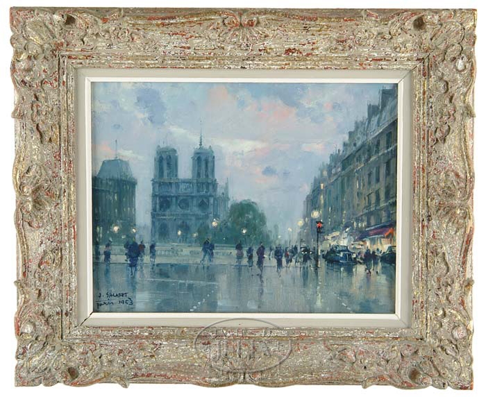 JEAN SALABET (French, 20th Century) “NOTRE DAME”. Oil on canvas evening scene shows the plaza outside Notre Dame Cathedral with figures walking on sidewalk and vehicles on the wet road. Signed lower left “J. Salabet Paris 1953”. Housed in its original fancy French style frame with painted liner. PROVENANCE: Woolworth Collection (FW Woolworth Dept. Stores). SIZE: 10” x 13”. CONDITION: Very good. 9-29539 (800-1,200)
