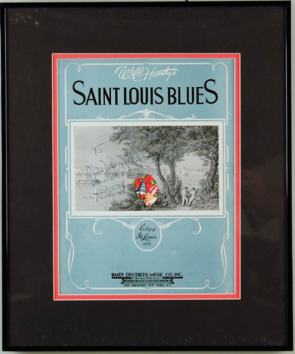 W.C. HANDY (American, 1873-1958) WORLD FAMOUS MUSICIAN “FATHER OF THE BLUES”. Signed sheet music “To Miss … Jones, Seasons Greetings, WC Handy 12-16-42”. Inscription and signature are on the center picture of a music sheet titled “Saint Louis Blues”, Handy Brothers Music Co. Inc.. Next to signature is a decorative bell decal. Housed in a black metal frame with black and red matte. PROVENANCE: Estate of Dr. and Mrs. Stanwood Schmidt of Eureka, CA. SIZE: 12” x 9”. CONDITION: Very good. 9-96014 (1,000-1,500)