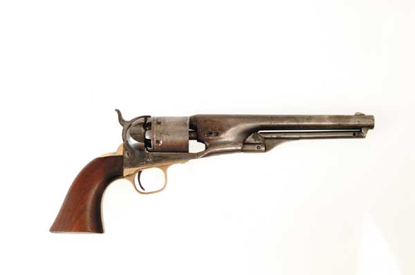 COLT 1861 NAVY REVOLVER. Cal. 36 Perc. Usual configuration with 7-1/2” round bbl, German silver front sight, brass trigger guard and backstrap with 1-pc walnut grips. SN 4508. CONDITION: Very good plus, all matching except the wedge, which is a replacement. Bbl retains about 30% thin original blue with the balance a light patina with scattered rust pitting and some hammer marks on both sides. The operating handle retains most of its original bright case colors with the balance turned silver. The frame retains bout 90% original case colors overall, bright and strong on the right side with a clean spot on the left side, bright in the sheltered areas. The cylinder is bright with numerous small cut marks and a double drag line. Retains about 70% original Naval battle scene. Grips are sound and crisp with minor edge wear, retaining most of their original finish. The trigger guard and backstrap are a light mustard patina and there are several small prick marks back of the trigger guard. Bright shiny bore with 3 or 4 spots of deep pitting. Fine mechanics. 4-49957 (4,000-7,000)