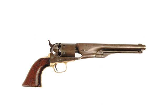 COLT MODEL 1861 NAVY REVOLVER. Cal. 36 Perc. Usual configuration with 7-1/2” round bbl, German silver front sight, brass trigger guard and backstrap with 1-pc walnut grips. The bottom of the right side grip is carved with an “H”. The cylinder is stamped with small inspector marks “LL” & an “F”. There appears to be also a small proof on the left side of bbl. SN 5481. CONDITION: Good to very good, all matching except the wedge, which is numbered to another revolver. Bbl retains an even light brown patina with fine surface pitting and a couple of dings. They cylinder is matching patina with scattered light pitting and retains 10-15% Naval battle scene. The frame is a light gray-brown patina. The trigger guard and backstrap are a light mustard patina, having been cleaned a long time ago. Grips are missing chips at both toes and another from the right bottom with handling and use marks and a bruise on the left side. Strong dark bore. Several screws are replaced. 4-49949 (1,500-3,000)