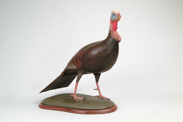 FINE CARVED AND PAINTED WOOD TURKEY BY FRANK FINNEY. Hen/turkey stands upon grass colored base mounted on a molded wood conforming stand. Nice realistic paint and detailed carving to head and tail feathers. Signed in grass with script initial. Frank Finney is one of America’s noted contemporary bird carvers. SIZE: 18-1/4” h x 19-1/2” l. CONDITION: Near excellent. 9-94402 (2,000-3,000)