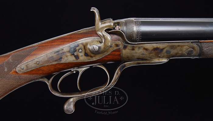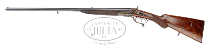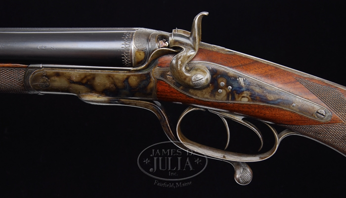 H. ROTH UNDERLEVER HAMMER CAPE GUN. SN 1400. Cal. 24 bore X what appear to be a 500 BPE 3” (Bore measures .500 and chamber is approx. 3” long with a straight tapered case). SN 1400. Fine light little rifle with 27” steel bbls, tapered, flat, matted rib with gold bead caterpillar front sight and 2-leaf express rear sight with doll’s head, extractor & dbl underbites. It has a dainty round action with side swinging underlever, deep scalloped firing pin wells with stippled top & peninsula back action locks with high spur delicate gooseneck hammers & dbl triggers, the right of which is set for rifle bbl. Mounted with highly figured, shell grain European walnut with lever latch full checkered splinter forearm and half hand buttstock with diamond shaped wrist & cheekpiece, 13-3/4” over a checkered horn buttplate. It has sling loops on bbl & stock. Weight: 6lb. 13.44 oz. CONDITION: Extremely fine. Bbls retain most of their orig strong blue. Receiver, lockplates, hammers & underlever retain about all of their orig case colors, brilliant on left side, slightly faded on right side and bottom of lever. Wood is sound with some light chemical spotting on buttstock with a few nicks & scratches and retains about all of its orig factory finish. Mechanics are crisp, brilliant shiny bores. 4-31116 JR308 (2,500-3,500)