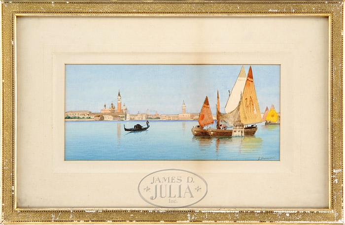 EUGENIO BENVENUTI (Italian, 1881-1959) DRYING THE NETS. Watercolor Venice scene shows a waterway with gondola and fishing boats, one with nets in air drying. The colorful sails are seen against a city backdrop with spires and domes. All under blue sky. Signed bottom right “E. Benvenuti”. Housed in a gilt antique frame with wide matte. SIZE: Sight: 6-1/4″ x 14″. CONDITION: Very light foxing line, otherwise very good. 9-92686 (700-900)